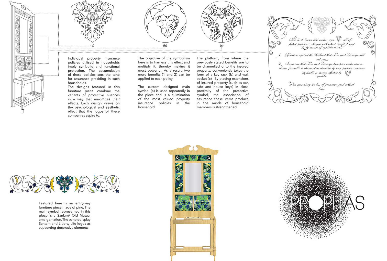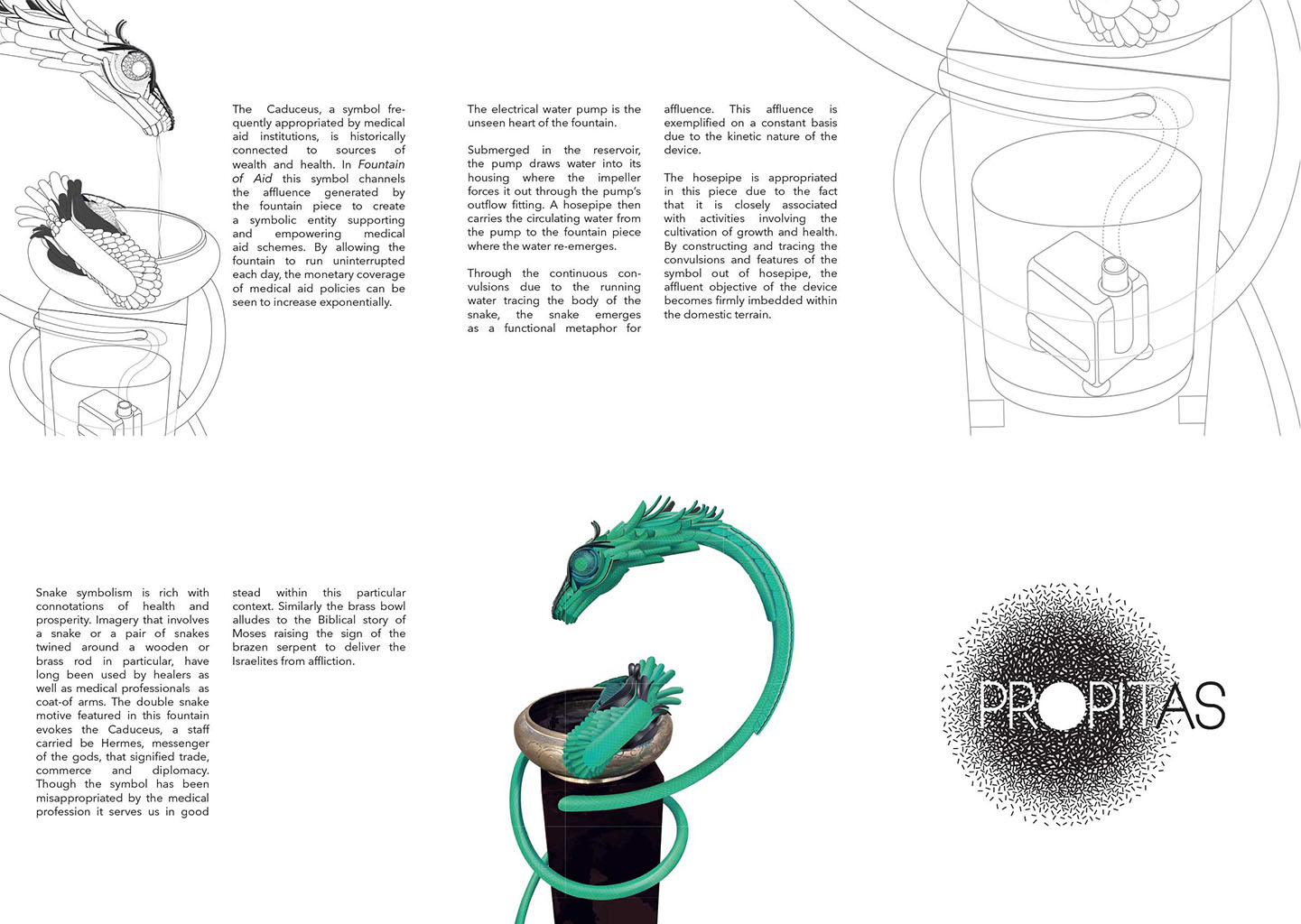 With the quasi-trademark of Propitas, the artist makes a fictitious consumer offer that targets the attitudes, expectations, fears and desires of the average middle-class household. Through imaginative play with elements from South African insurance, security, marketing and spiritual industries, the exhibited artworks make offers and promises for the propitiation and soothing of fate and, as such, suggest serenity for the implied consumers.